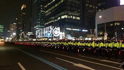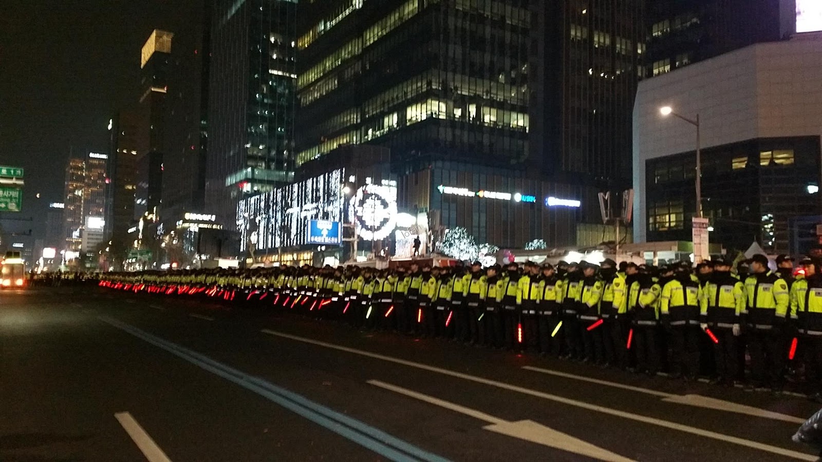 清溪川沿岸,耶誕節的彩燈幻映在雙雙對對情侶的面龐;橋下有父母喚著孩子的名字提醒他們小心奔跑,別離流水太近。這裡聽不見抗議的呼喊,雖然也是和兩個聚點僅數百米之遙。